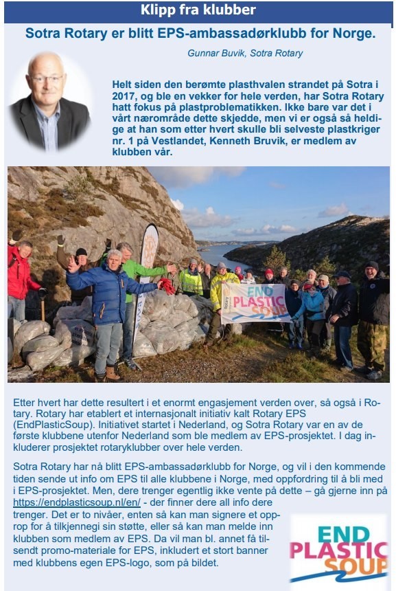 End Plastic Soup (EPS) er et internasjonalt prosjekt i Rotary. Sotra Rotary Klubb er støttespiller og ambassadør for EPS.